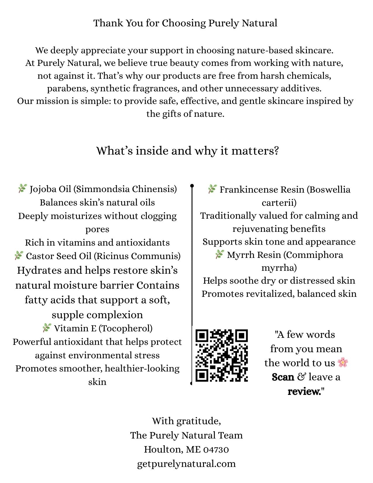 ✨ Myrrh Resin – Traditionally treasured for its ability to reduce fine lines, firm the skin, and restore a healthy glow.
